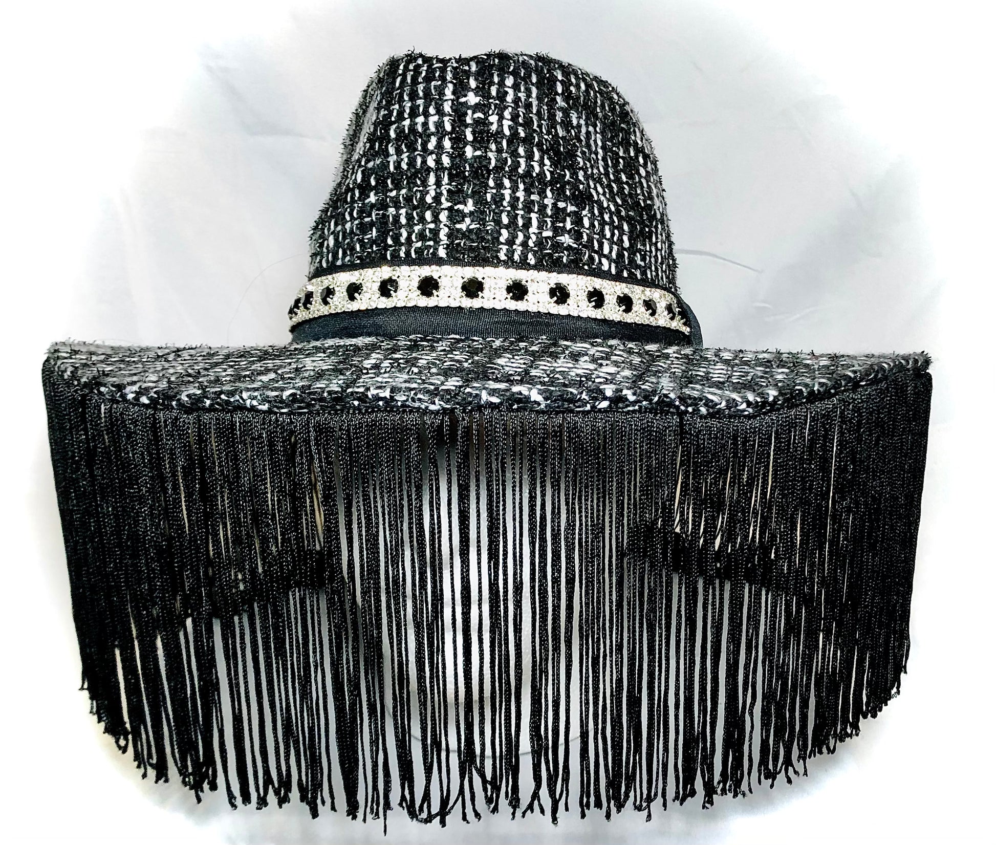 Black/White Knit Wool Hat with Black Fringe and small Diamond Trim