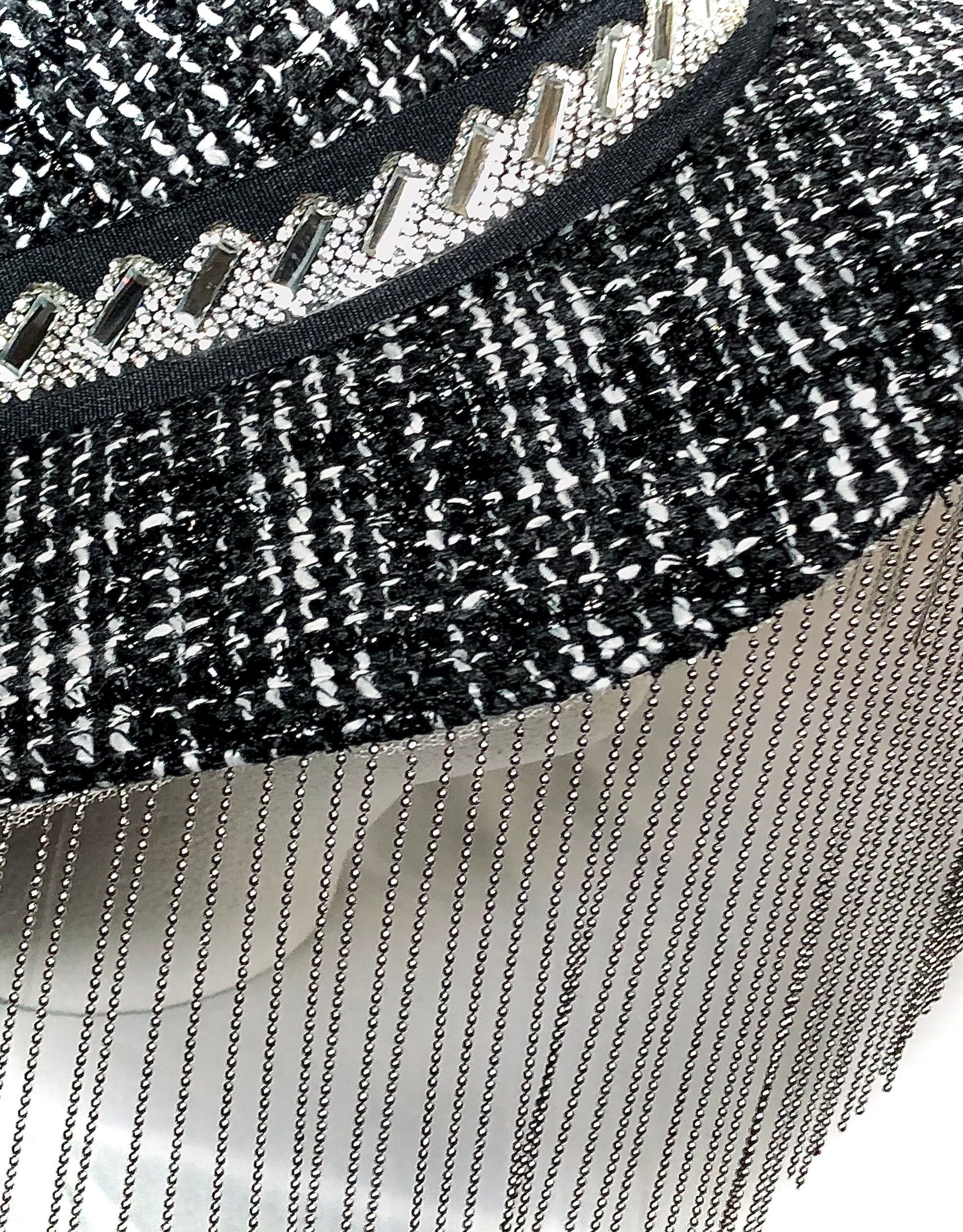 Black/White Wool Knit Hat with Crystal Trim and Chain Fringe