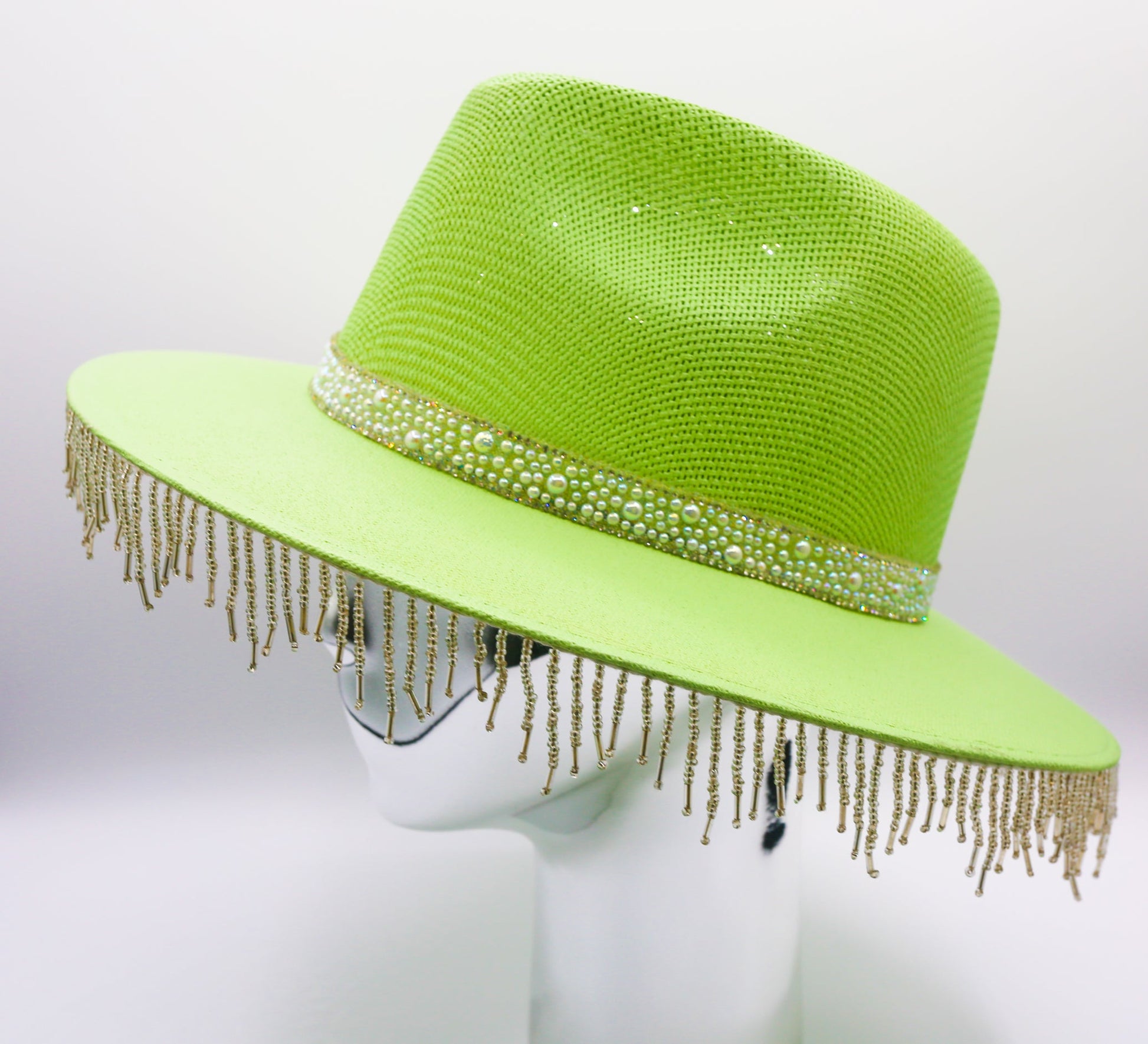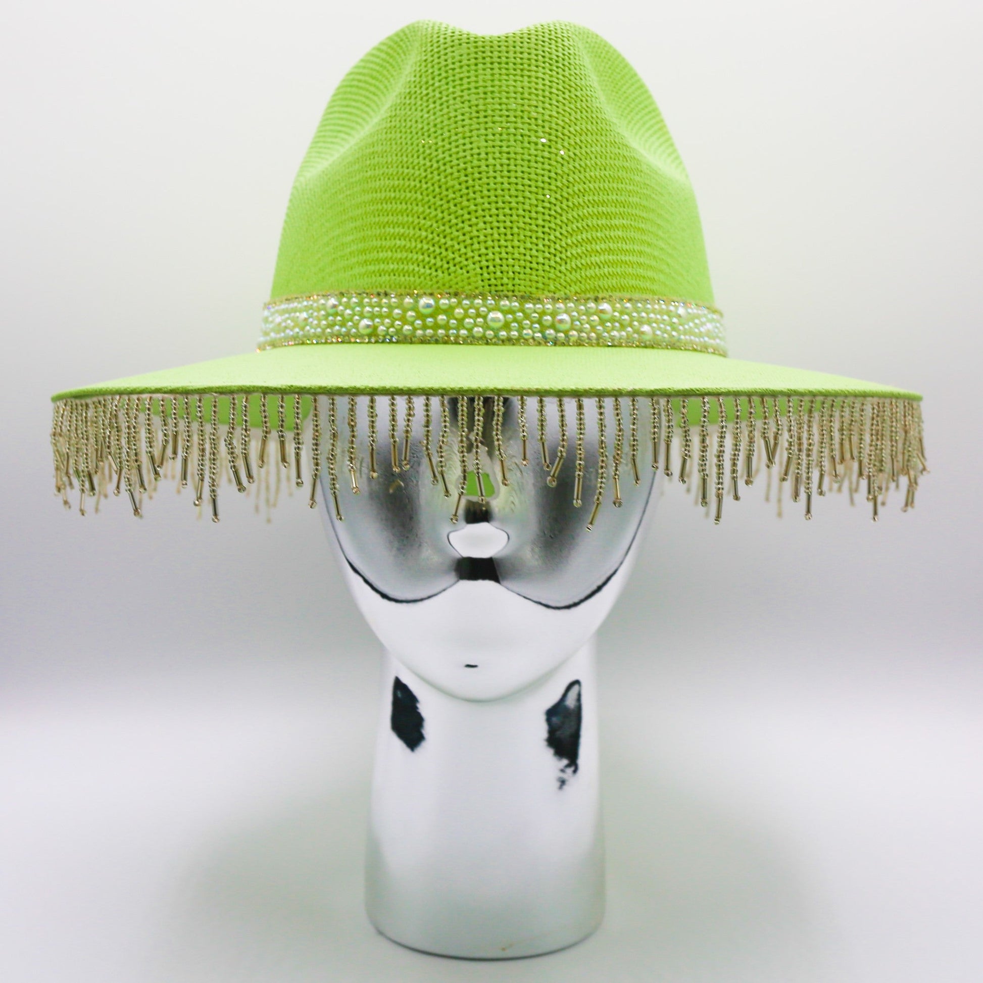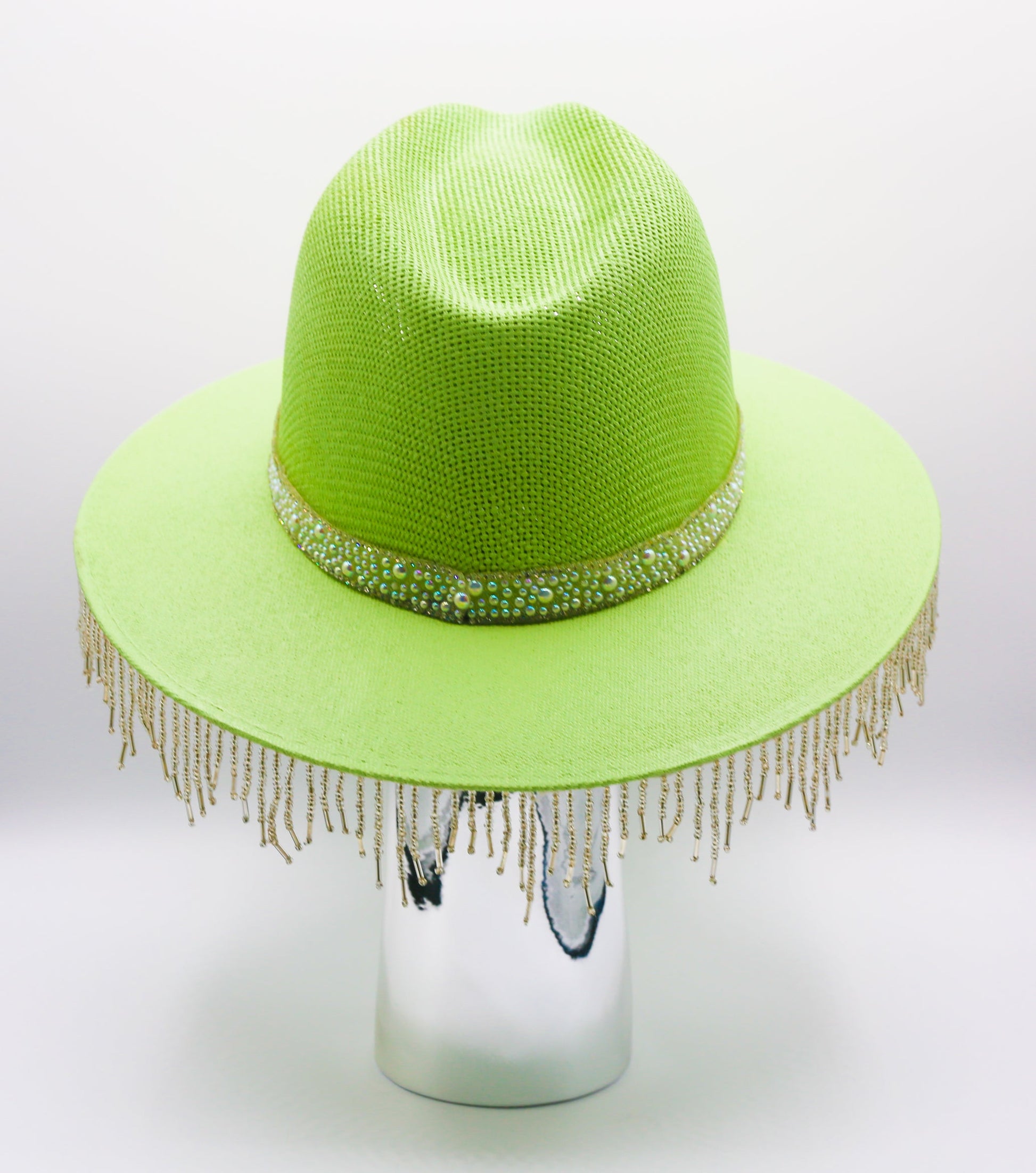 Stylish classic Panama straw hat with hand embellished fringe. Perfect to complement those summery outfits and breezy style. Add a splash of color to any outfit with this legendary style. Crystal accents and beaded fringe on the brim.