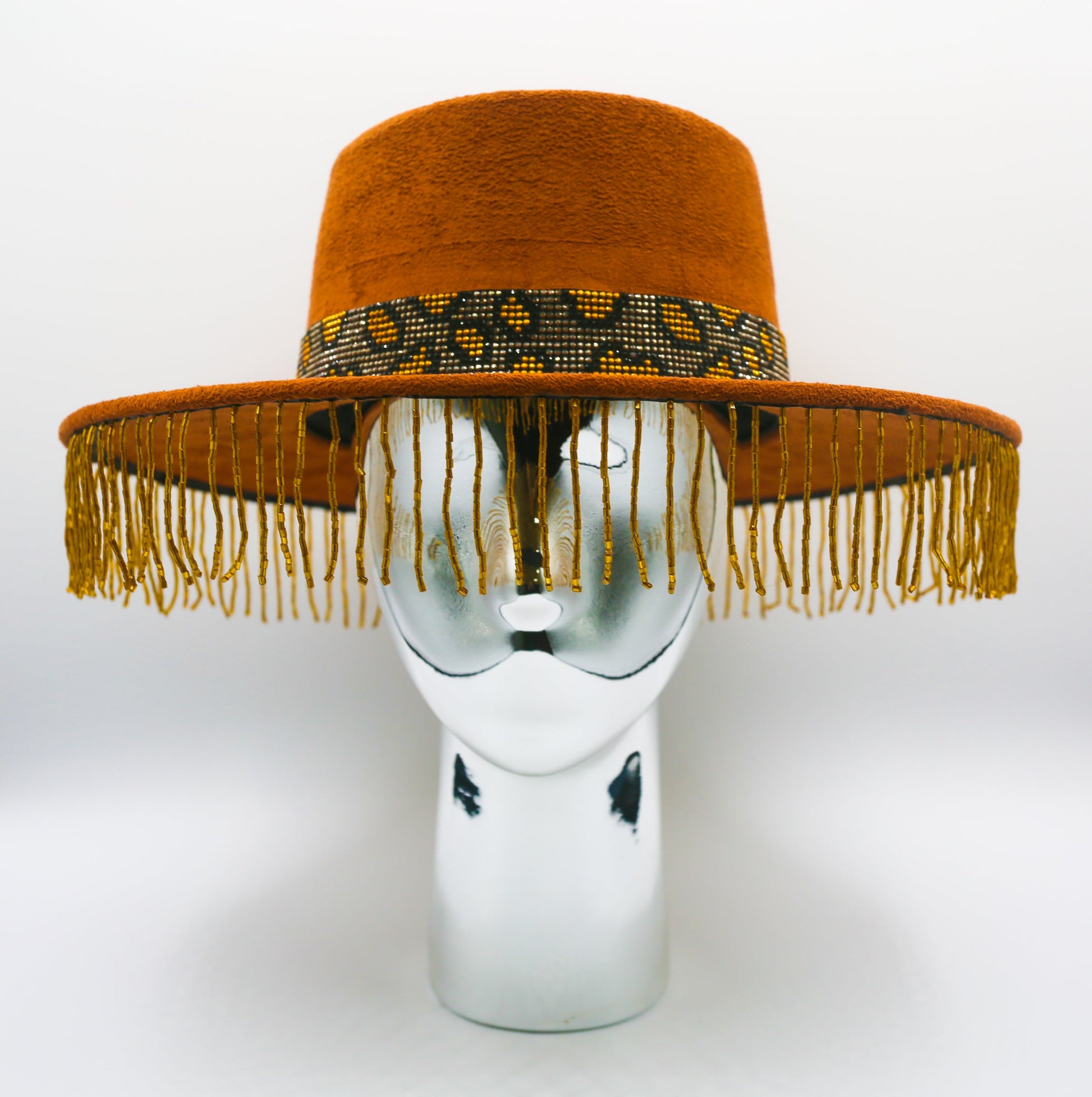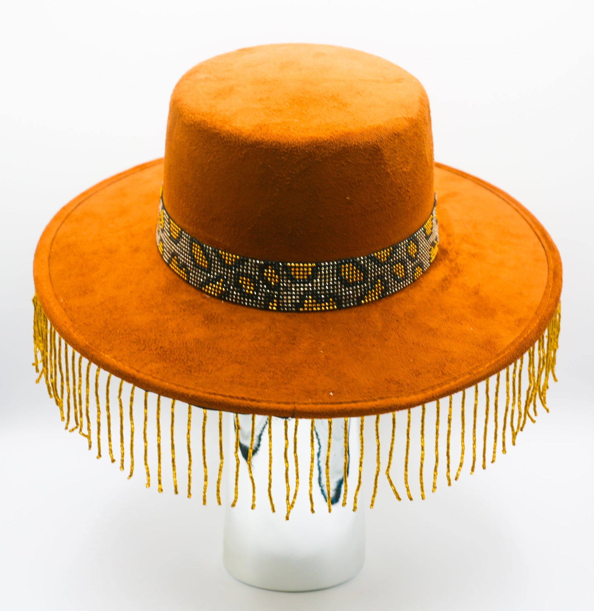Make a statement with the Atousa G Vicenza hat. Crafted from 100% suede and hand embellished with beaded band and beaded fringe for a luxurious look and legendary style. Timeless taste with a modern twist, a perfect addition to any outfit.